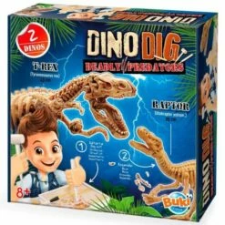 The set contains a block of plaster to dig up the bones of a Tyrannosaurus Rex and a Velociraptor.