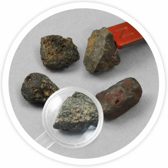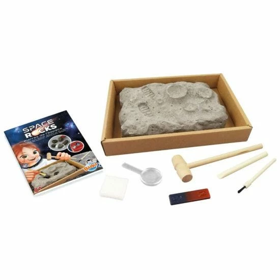Use the included tools that include a hammer and chisel to dig up and observe five stones from space, including a real meteorite and tektites from the realistically styled lunar surface plaster block with craters and astronauts’ footprints.