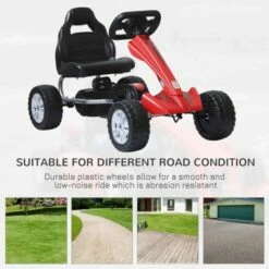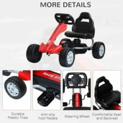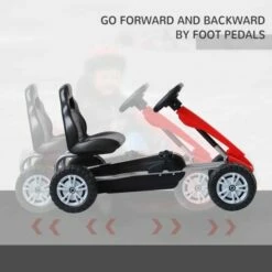 This ride on go cart by HOMCOM is a safe and easy-to-operate pedalling toy that can be enjoyed on most hard surfaces or grass. Constructed from a rugged steel and plastic, it allows for a smooth and durable ride every time. It is an ideal way to keep kids busy and active.