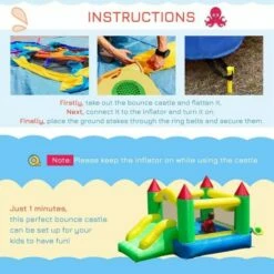 This inflatable Homcom bouncy castle is a perfect choice for children, made with a non-woven fabric which is fire, waterproof and puncture preventive material. High quality two-way stitching used to make the shapes and strengthened the seams.