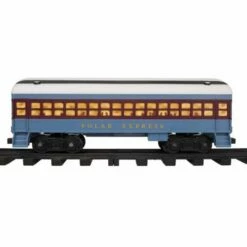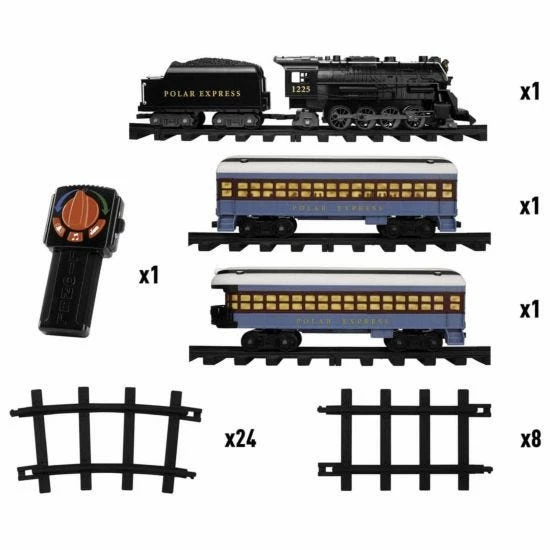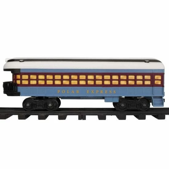 The four piece train is made up of 1 locomotive engine, 1 engine tender, 1 train carriage and 1 observation carriage and features 2 movie announcements – All Aboard, this is The Polar Express, and I am the King of the North Pole.