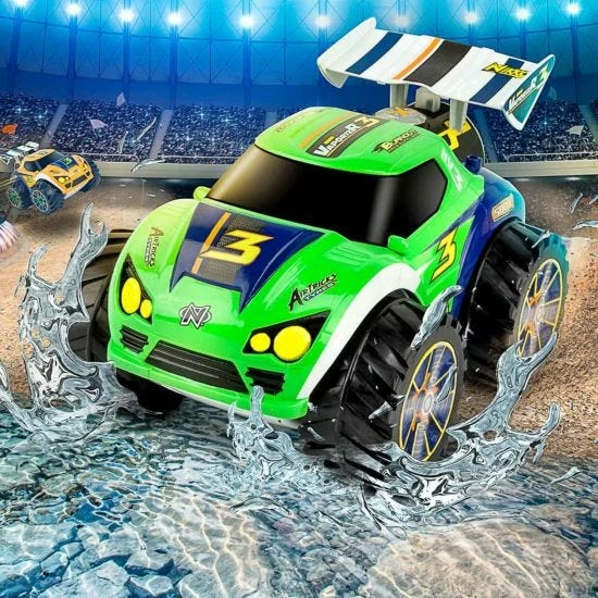 Your little driver will have hours of fun with this remote control car it features a fully functioning tank steering with 4×4 power for fun on land and water! It has two motors for 360 degree spinning with a maximum speed of 9.3 mph.