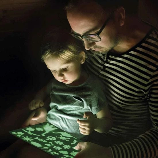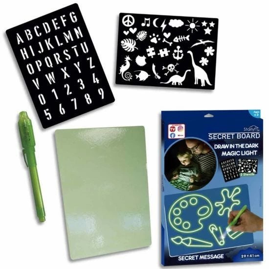 The Starlyf Secret Writing Pad is a large magic light drawing board where drawings will glow in the dark, thanks to its photoluminescent surface that absorbs light and then glows in the dark.